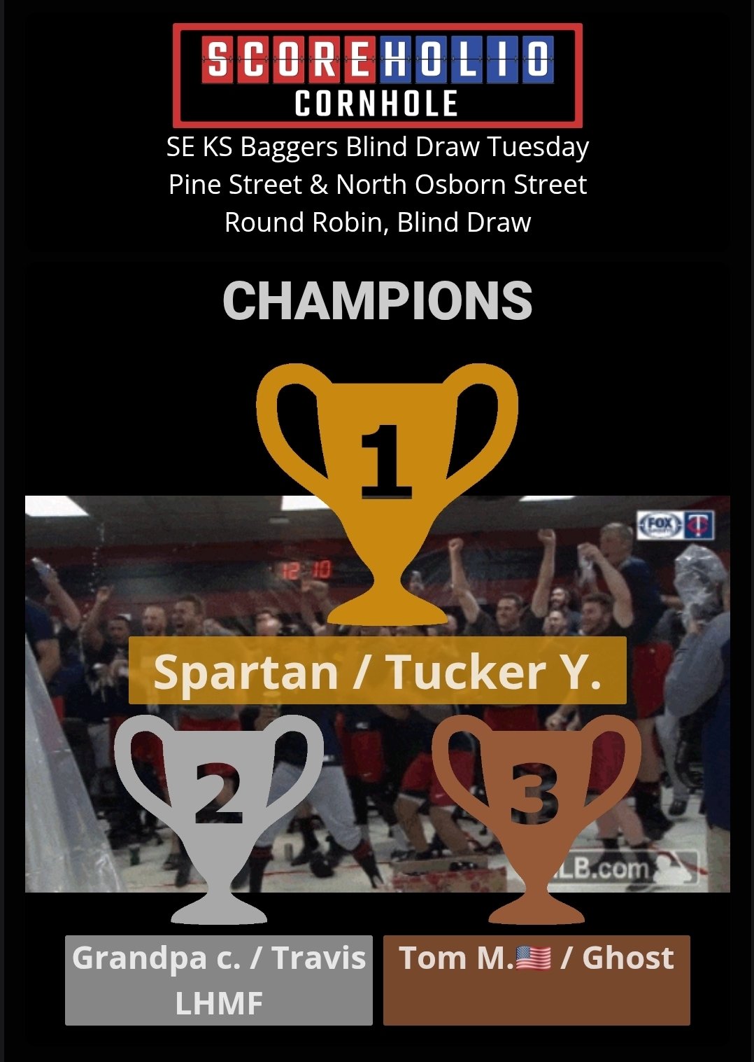 SE KS Baggers wants to thank everyone for another nice turnout for our October 7th, Tuesday Night Blind Draw Tournament at Gas City, KS. We had 13 players. Please join us again on October 14th  for our next Tuesday Night Blind Draw. It is already set up on Scoreholio.   Please support our sponsors and let them know we appreciate them.