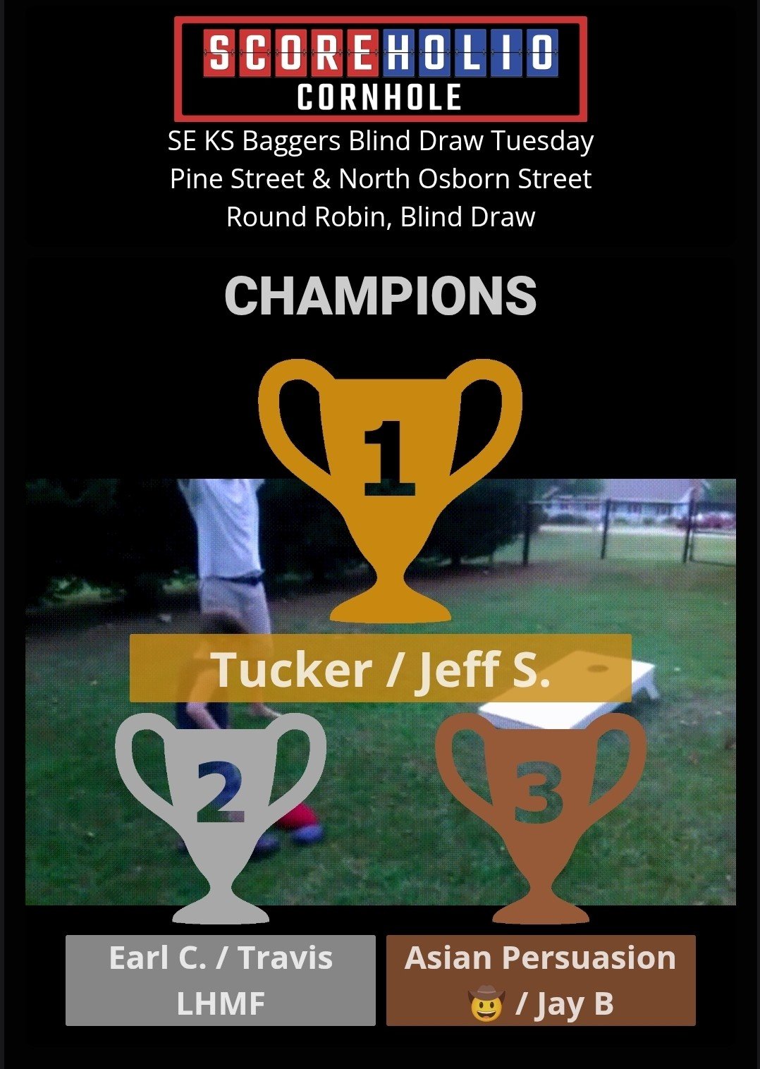 SE KS Baggers wants to thank everyone for turning out for our December 23tf, Tuesday Night Blind Draw Tournament at Gas City, KS. We had 23 players. Our next Tuesday Night Blind Draw will be on December 30th. It is already set up on Scoreholio. Please support our sponsors and let them know we appreciate them.