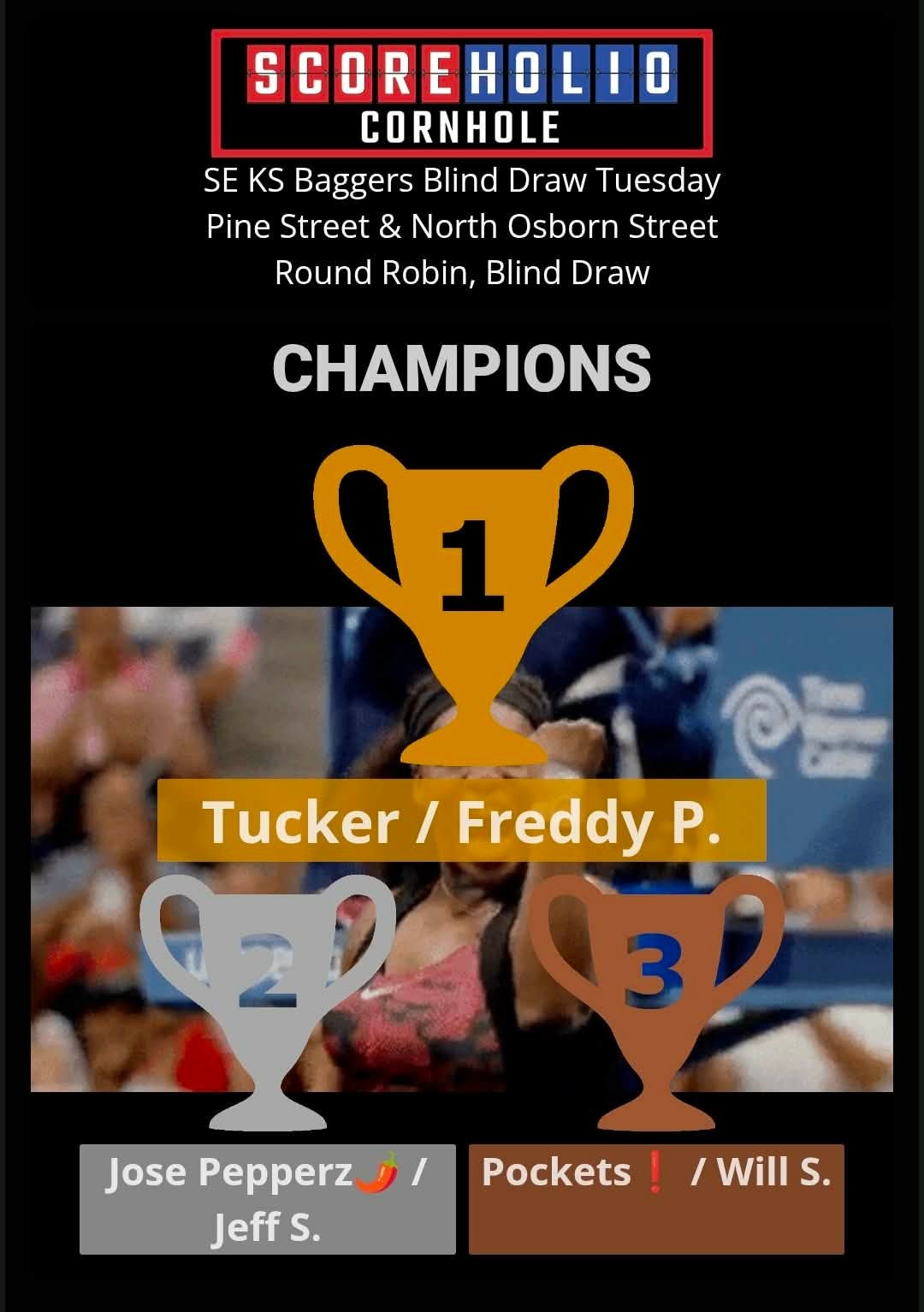 SE KS Baggers wants to thank everyone for turning out for our December 30th, Tuesday Night Blind Draw Tournament at Gas City, KS. We had 24 players. Our next Tuesday Night Blind Draw will be on January 6th . It is already set up on Scoreholio. Please support our sponsors and let them know we appreciate them.