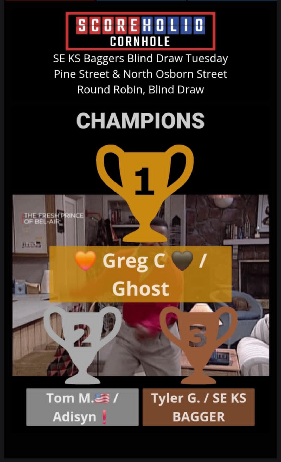 SE KS Baggers wants to thank everyone for another nice turnout for our April 8th, Tuesday Night Blind Draw Tournament at Gas City, KS. We had a great turnout of 29 players. Please join us again on April 15th for our next Tuesday Night Blind Draw. It is already set up on Scoreholio.