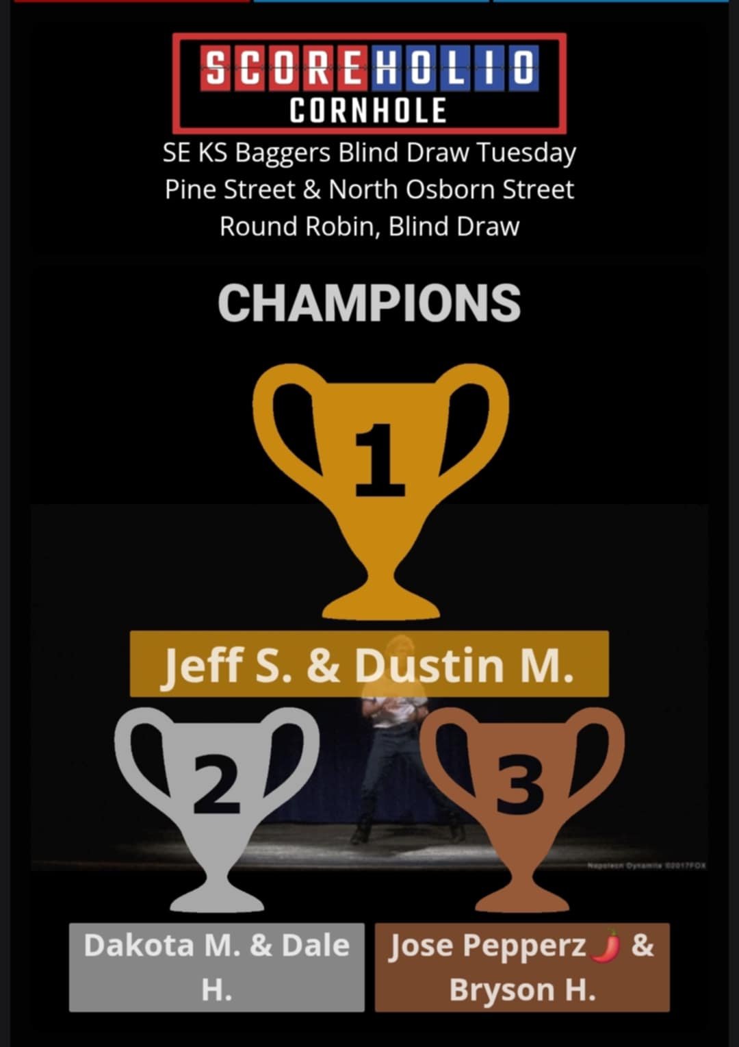 SE KS Baggers wants to thank everyone for another nice turnout for our May 20th, Tuesday Night Blind Draw Tournament at Gas City, KS. We had a great turnout of 20 players. Please join us again on May 27th for our next Tuesday Night Blind Draw. It is already set up on Scoreholio.
