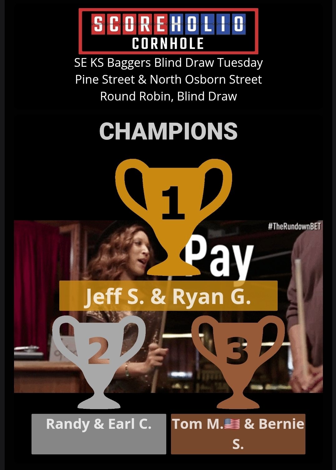 SE KS Baggers wants to thank everyone for another nice turnout for our July 8th, Tuesday Night Blind Draw Tournament at Gas City, KS. We had a lighter than normal turnout of 12 players but had a great time. Please join us again on July 15th for our next Tuesday Night Blind Draw. It is already set up on Scoreholio.