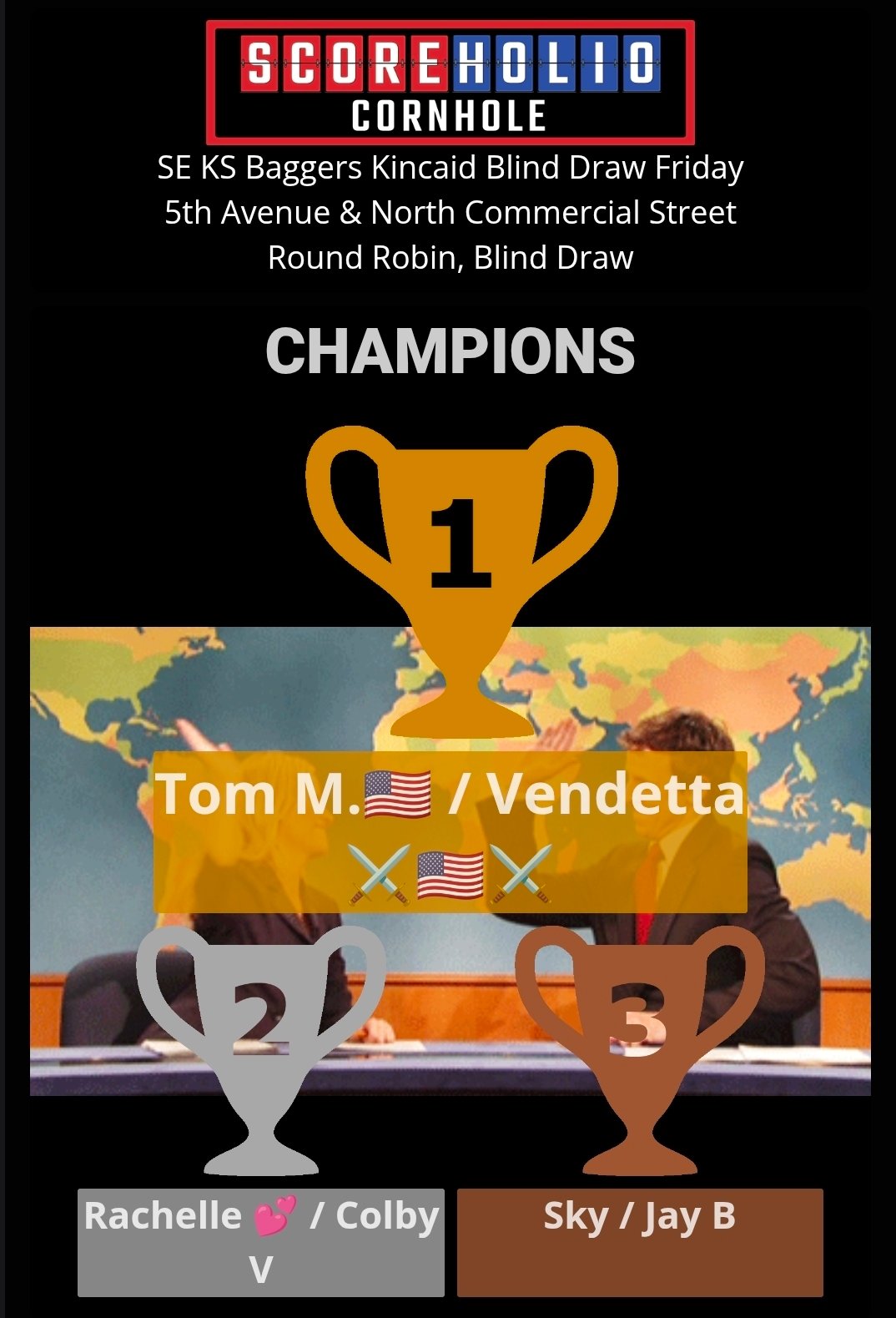 SE KS Baggers wants to thank everyone for turning out for our February 13th, 2026 Friday Night Blind Draw Tournament at Kincaid, KS. We had 30 players. Please join us again on Friday, February 20th for our next Friday Night Blind Draw in Kincaid, KS. It isare already set up on Scoreholio. Please support our sponsors and let them know we appreciate them.