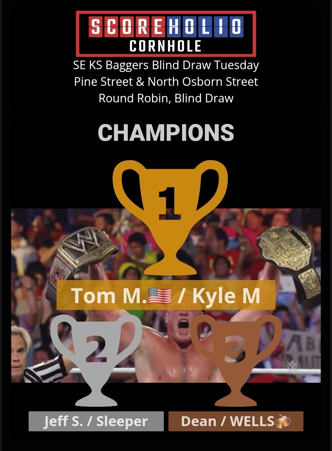 SE KS Baggers wants to thank everyone for turning out for our October 21st, Tuesday Night Blind Draw Tournament at Gas City, KS. We had 19 players. Please join us again on October 28th for our next Tuesday Night Blind Draw. It is already set up on Scoreholio. Please support our sponsors and let them know we appreciate them.